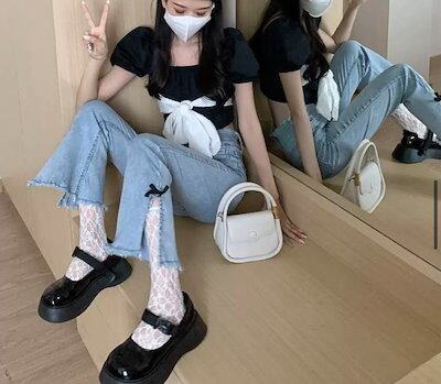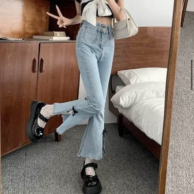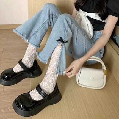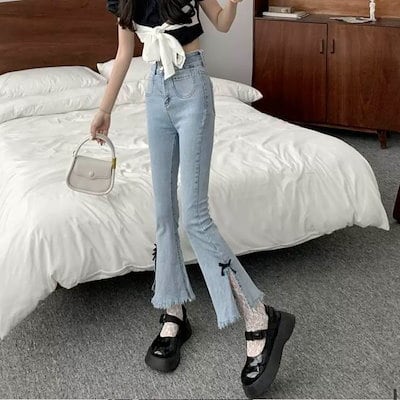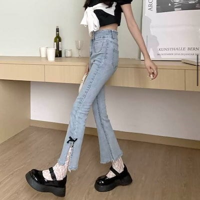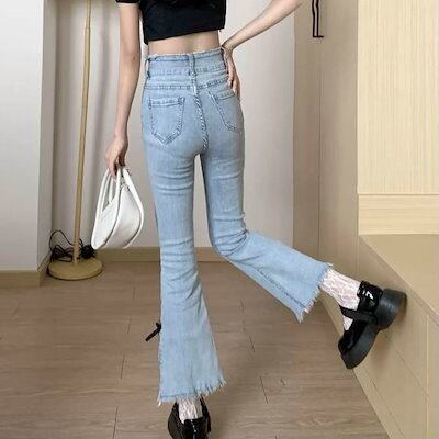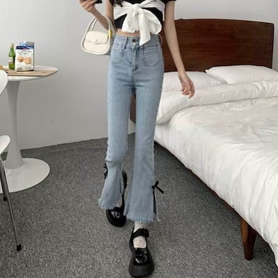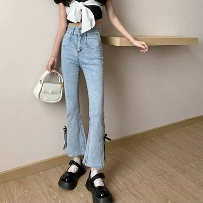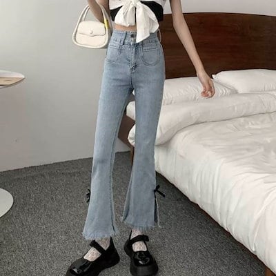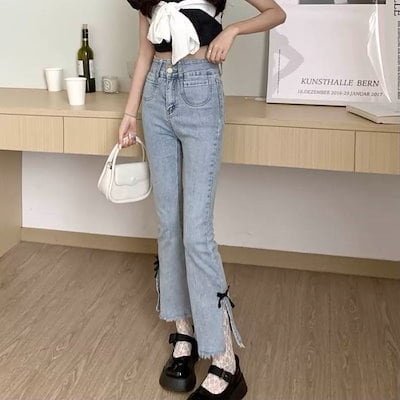 ジーンズ デニム パンツ レディース ボトムス サイド リボン スリット おしゃれ 個性的 ハイウエスト ブルーデニム タイト スリム ラッパ アンクル丈 ズボン 春 秋 大人かわいい 主役級 フリン
