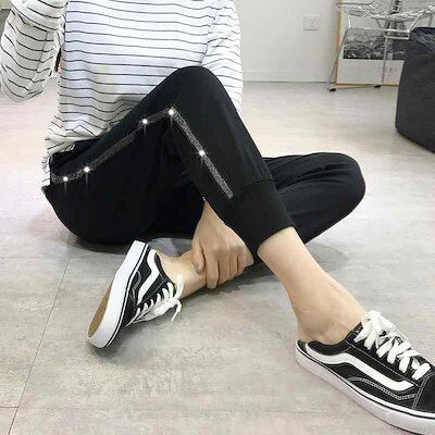 ジョガーパンツ 9分丈 アンクル丈 レディース スポーツウェア ゆったり ヨガパンツ ジャージ スウェット 黒 ブラック かっこいい きれいめ クロップドパンツ ヨガウェア キラキラ ライン ストレー