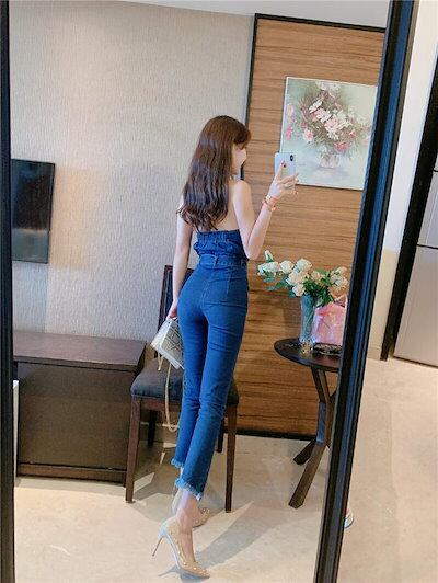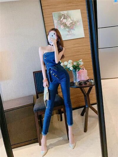 デニムパンツ レディース ジャンプスーツ オールインワン パンツ デニム スリム タイト セクシー おしゃれ 可愛い リボン チューブトップ アンクルパンツ 9分丈パンツ ノースリーブ ハイウエスト