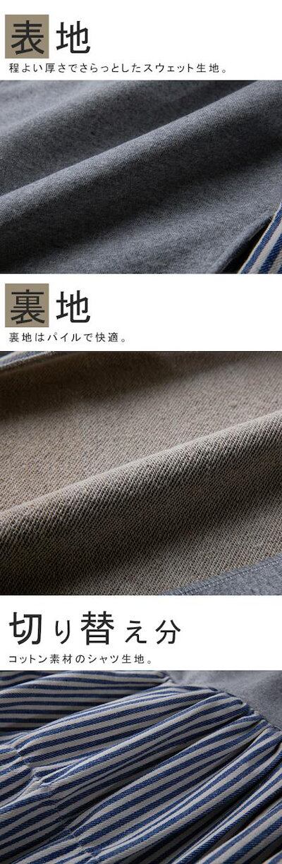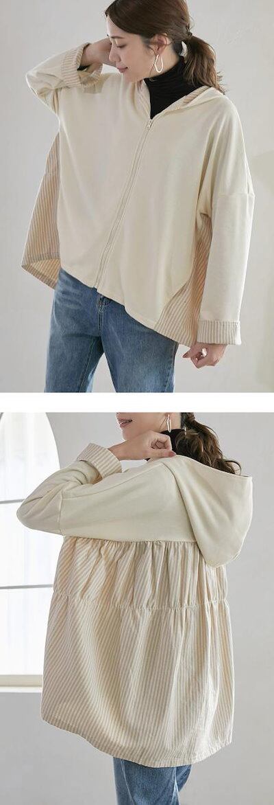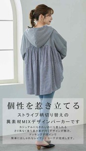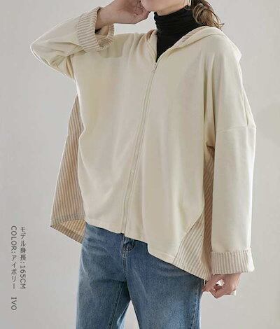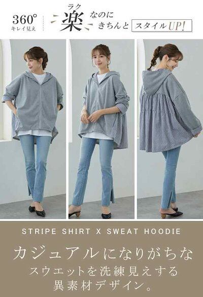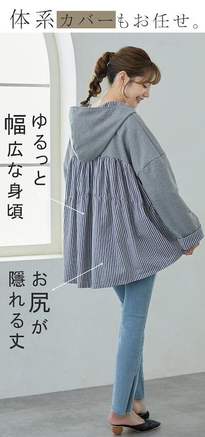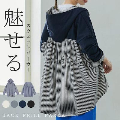 スウェット パーカー ストライプシャツ切り替え バックフリル アウター レディース ライトアウター ロング トップス トレーナー