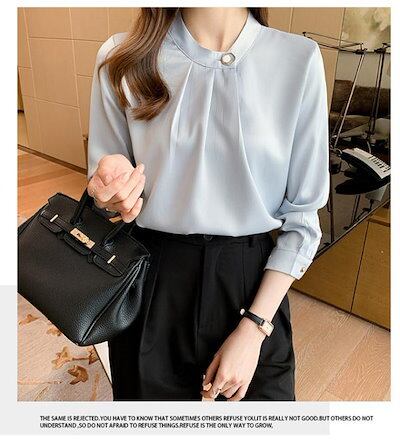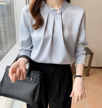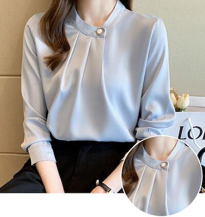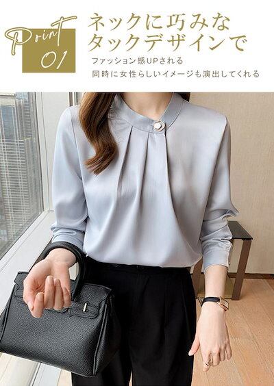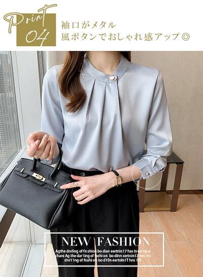 ブラウス 長袖 レディース OL シャツ スタンドカラー フォーマル シャツ タック 立ち襟 デザインボタン付き ファッション 長袖 エレガント おしゃれ トップス スーツインナー 通勤 ビジネス 入