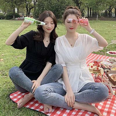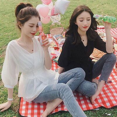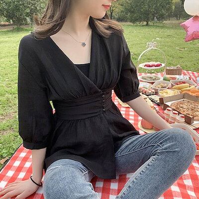 【急速出荷!】シースルー ブラウス おしゃれ レディース 夏 きれいめ トップス 半袖 5分袖 ボタン 和風 ハイウェスト Vネック black white 黒 白 大人可愛い涼しげ シャツ Tシャツ