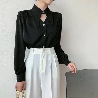ブラウス シャツ?長袖?レディース 感 ロングスリーブトップス 体型カバーチュニック シンプル通勤 韓国ファッション ボタン 切り替え
