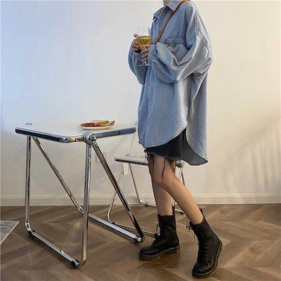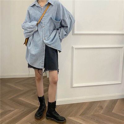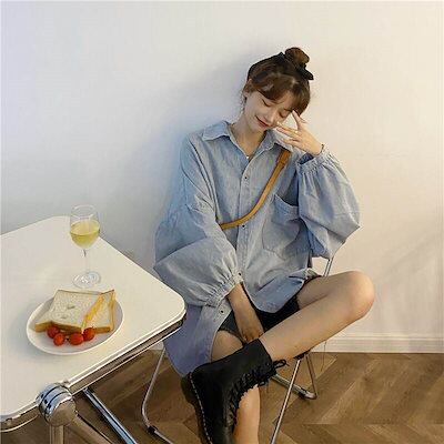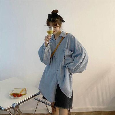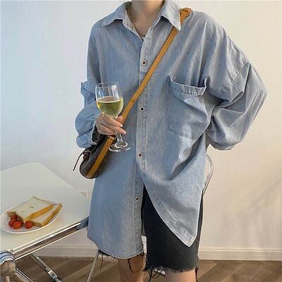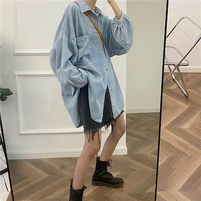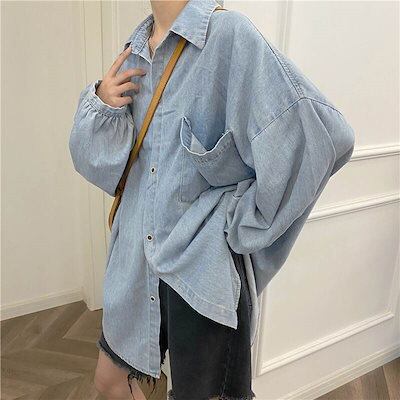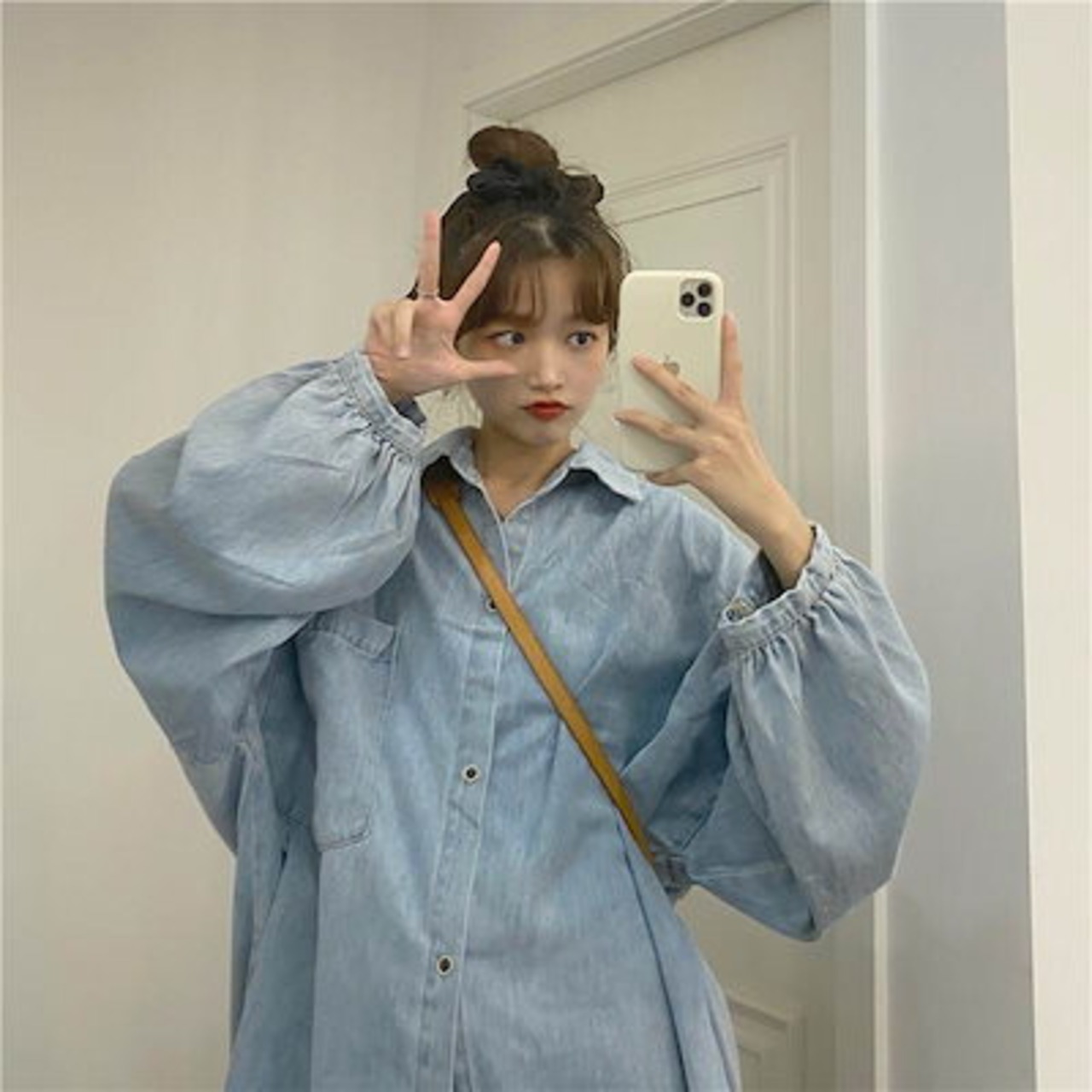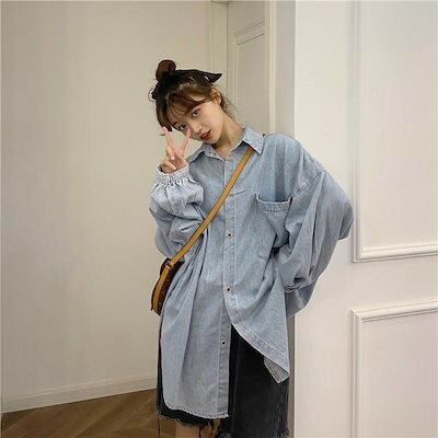 再販未定デニム シャツ ブラウス 長袖 青 レディース 春 秋 トップス ブルーデニム バルーンスリーブ ビッグシルエット ボタン 個性的 レトロ 可愛い ポロカラー ユニーク 韓国 ファッション 袖