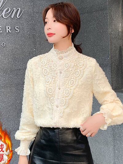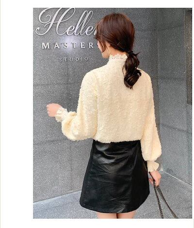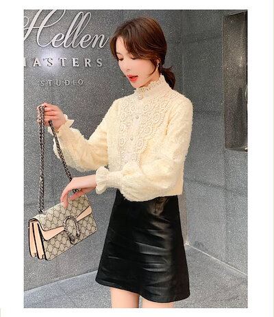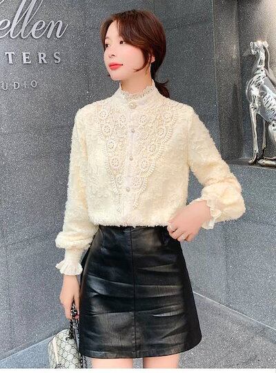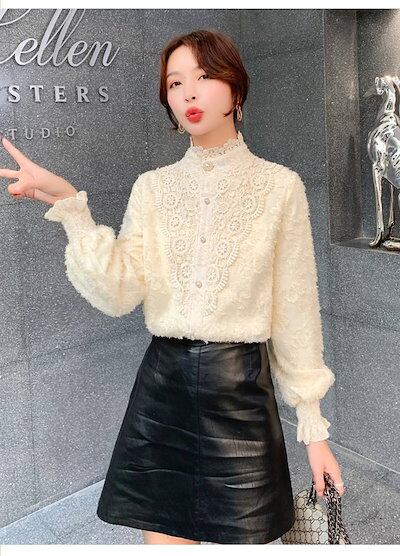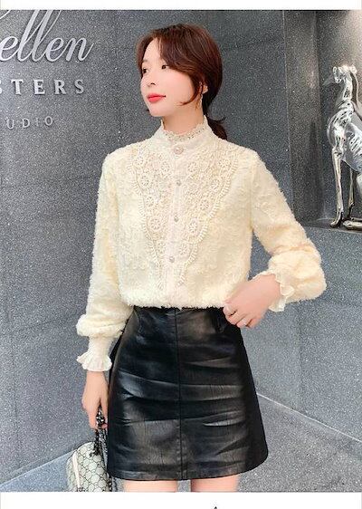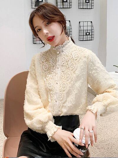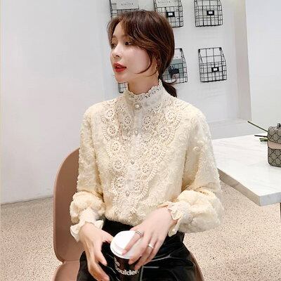 初回限定トップス レディース シャツ ブラウス 長袖 春 秋 冬 10代 20代 30代 40代 50代 スタンドカラー ランタンスリーブ ボリューム袖 レース パールボタン おしゃれ きれいめ トッ