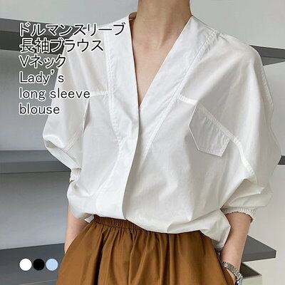 ブラウス レディース 長袖シャツ 無地 Vネック ノーカラー スリーブ 前開き トップス カジュアル 飾りポケット付き ボタン付き 体型カバー 着回し シンプル 出掛け 春秋 普段着 通勤 ボリューム