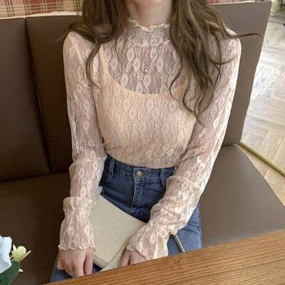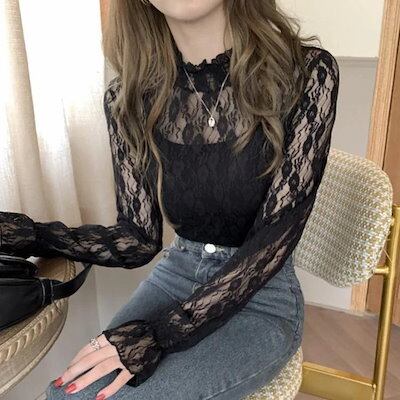 インナー 長袖 レース ドット シアー レディース トップス シースルー カットソー タートルネック レイヤード 重ね着 着回し シアーブラウス 薄手 花柄 水玉 透け 選べる2柄 秋