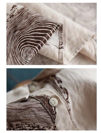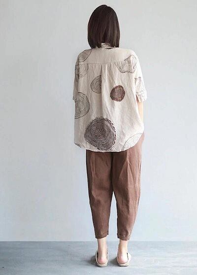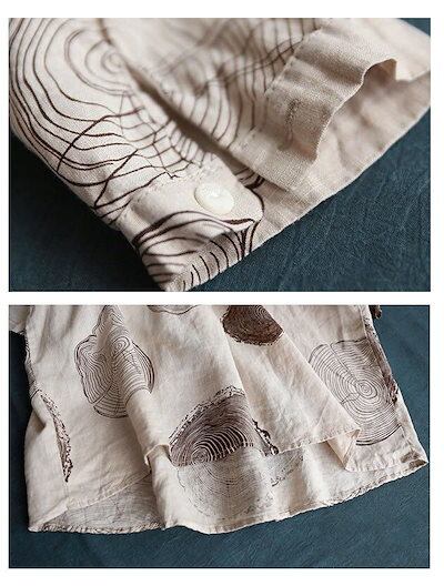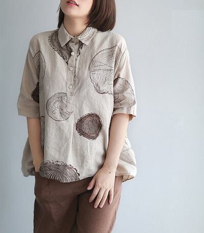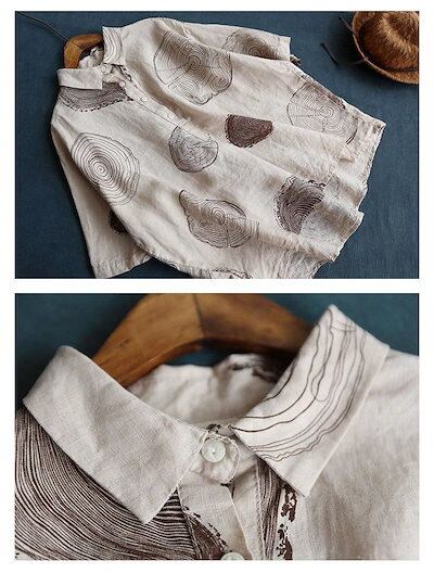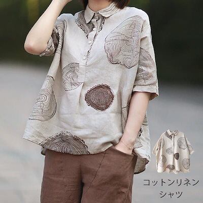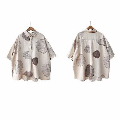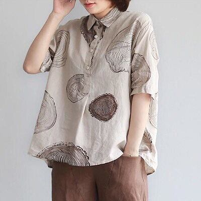 リネン シャツ 半袖 ブラウス 涼しい 半袖シャツ 襟付き リネンシャツ レディース コットンリネン シャツブラウス トップス 綿シャツ コットンシャツ 麻シャツ 綿麻 柄 プリント年輪 大人 おしゃ