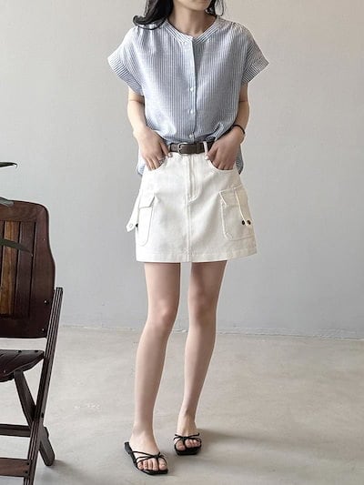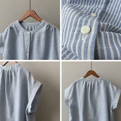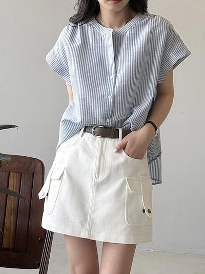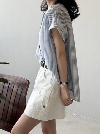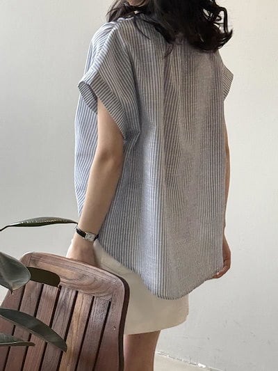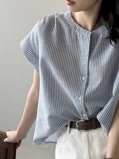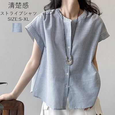 ストライプシャツ 半袖 レディース シャツ ストライプ フレンチスリーブ ブラウス 夏 半袖シャツ 半袖ブラウス 柄 おしゃれ トップス 前開き 前後差 シャツブラウス バンドカラー ギャザー ゆった