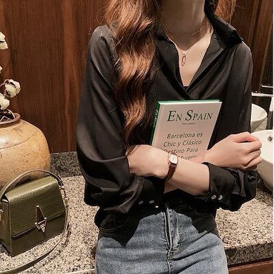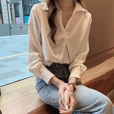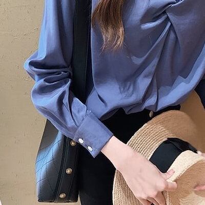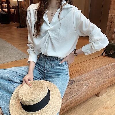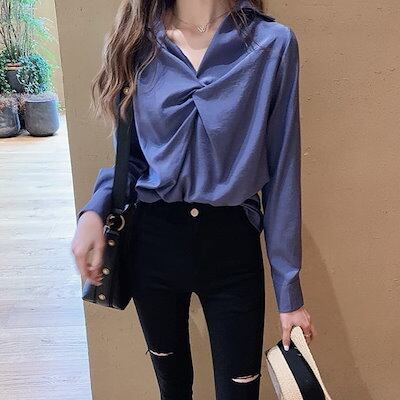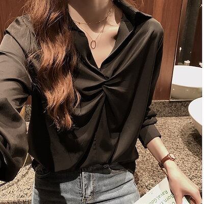 トップス レディース ブラウス 袖あり 長袖 襟なし フリル 無地 ノット ギャザー キーネック