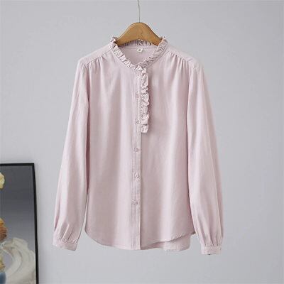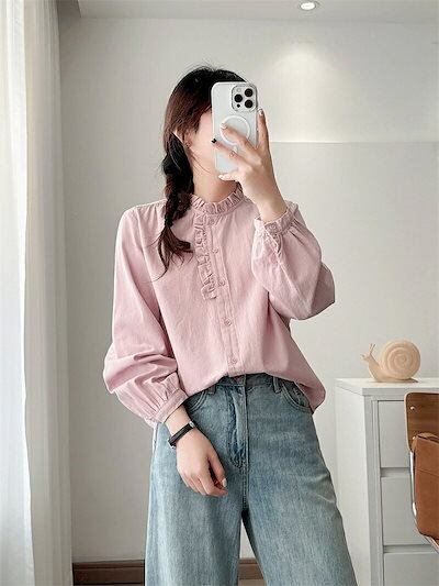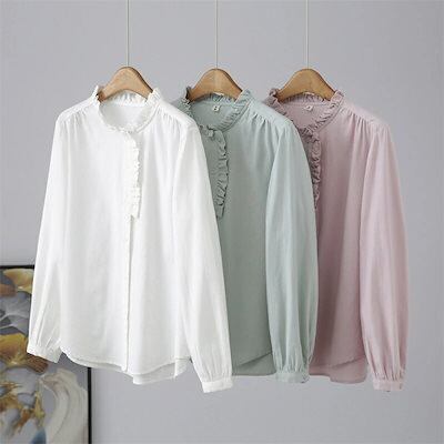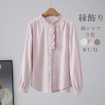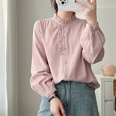 長袖 ブラウス トップス シャツ レディース 春 チュニック 綿100% 長袖ブラウス 長袖トップス 綿 コットン シャツブラウス 立ち襟 縁飾り 無地 前開き ボタン留め 夏 ゆったり 通気