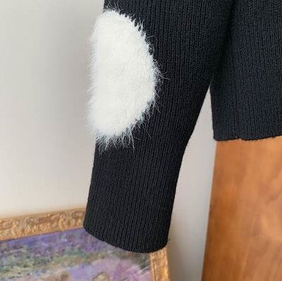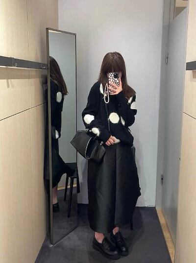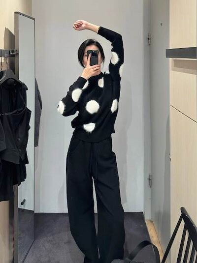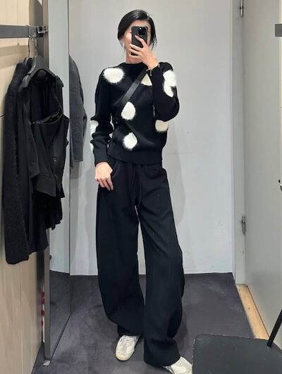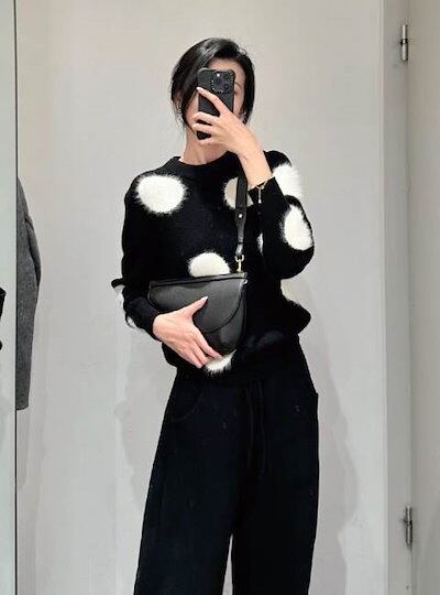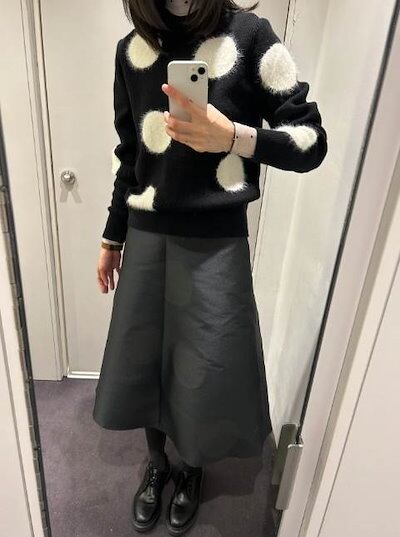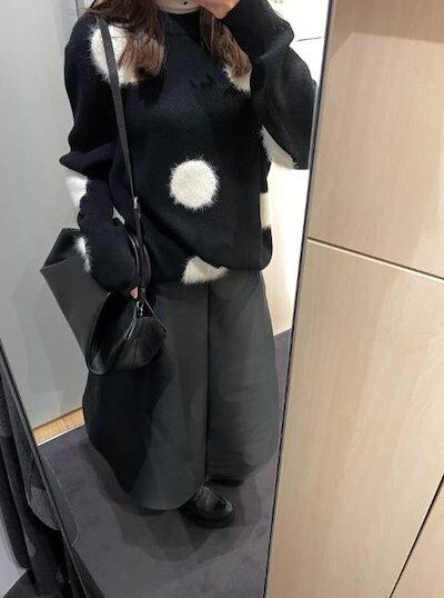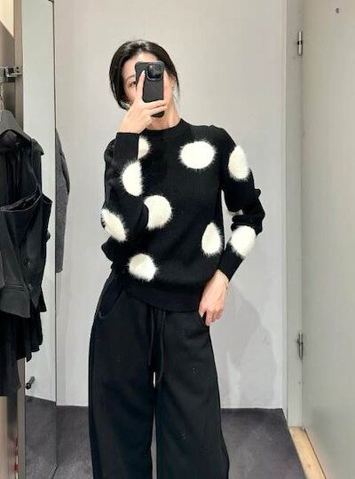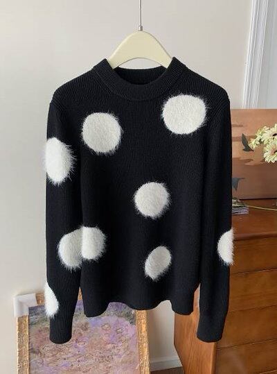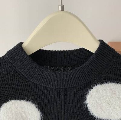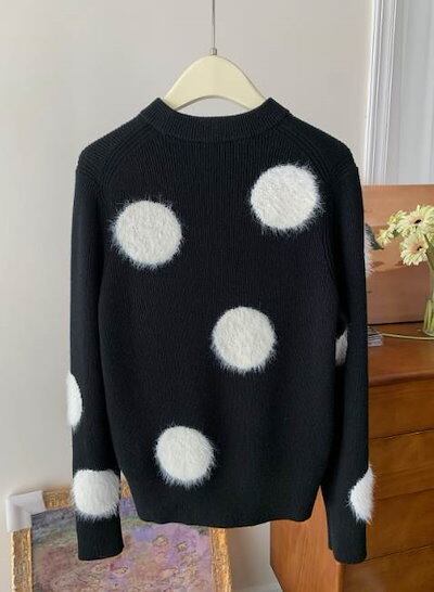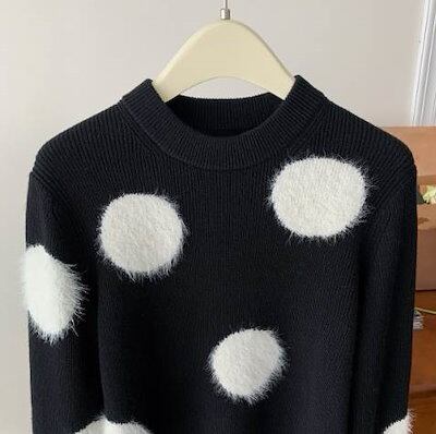 クーポン有トップス レディース ニット セーター プルオーバー 春 普通丈トップス 長袖 ラウンドネック 襟なし ノーカラー ストレート ふっくら 伸縮性 ブラック 黒 ドット柄 水玉 XS SS S