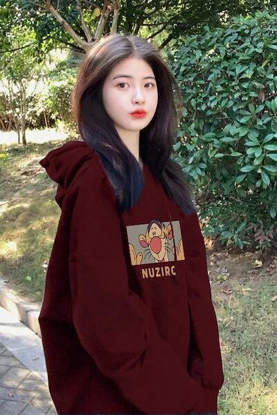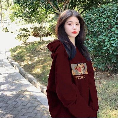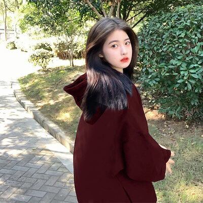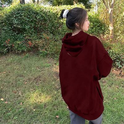バーガンディアメカジレトロトレーナーレディース春秋ゆったり着回しフード付き長袖トップス