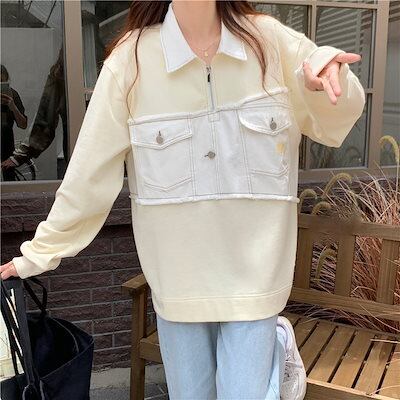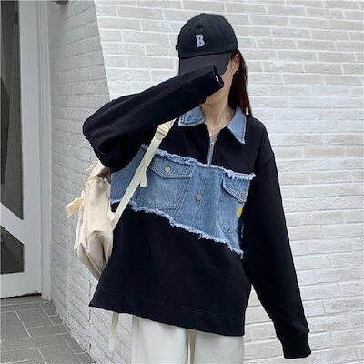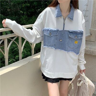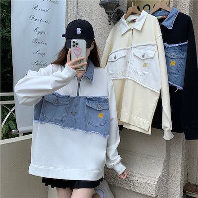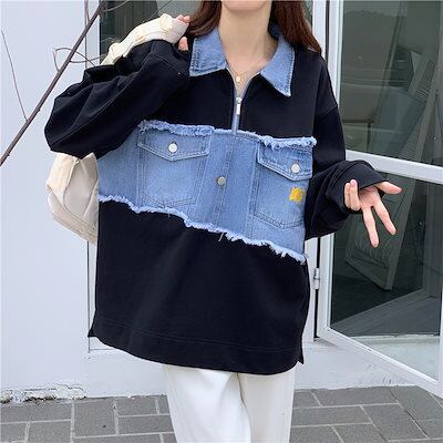 秋服作個性デザインスウェット色切り替えデニムコントラストカラーカーディガンアウタージャケットゆったりレディーストップス通勤体型カバー
