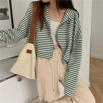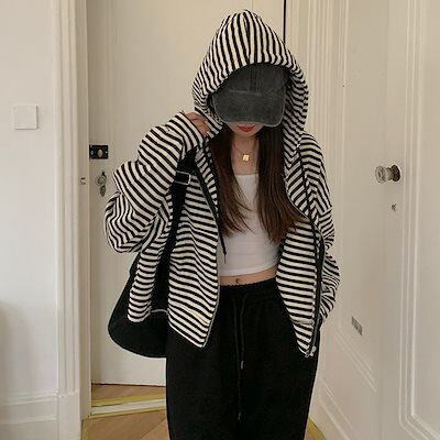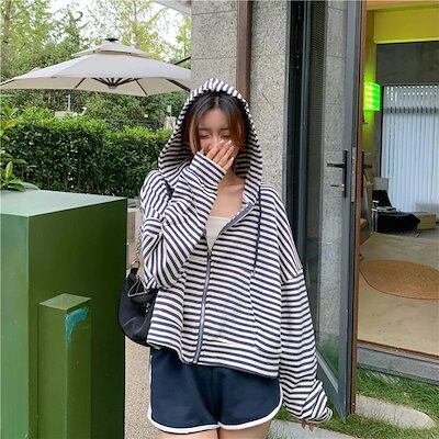 パーカーストライプ薄いジップジャケットレディース2025秋作ゆったりカジュアル長袖学生ショートトップス韓国