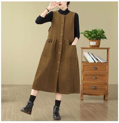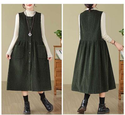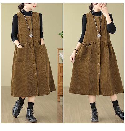 【2点購入25O円OFF】ワンピース ジャンパースカート レディース 秋 冬 ロングベストワンピース レイヤード コーデュロイ 羽織り ボタン留め ジャンスカ ラウンドネック ロングワンピース ワン
