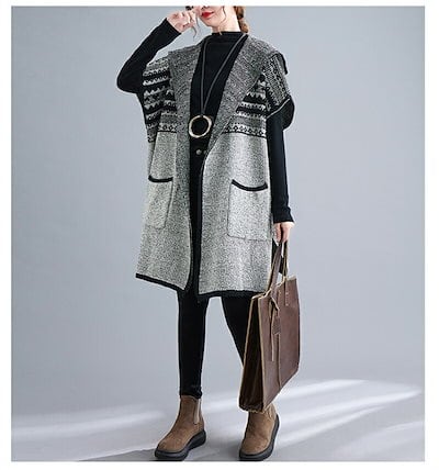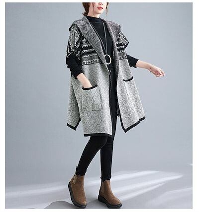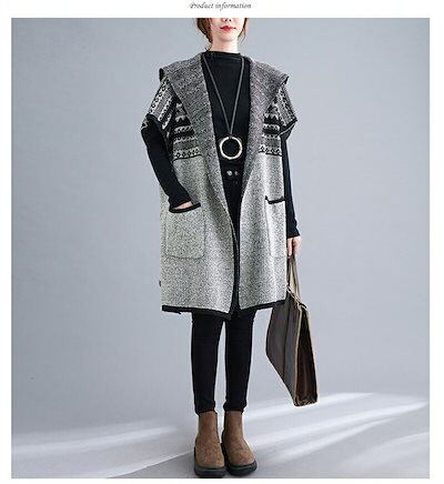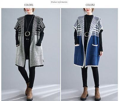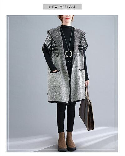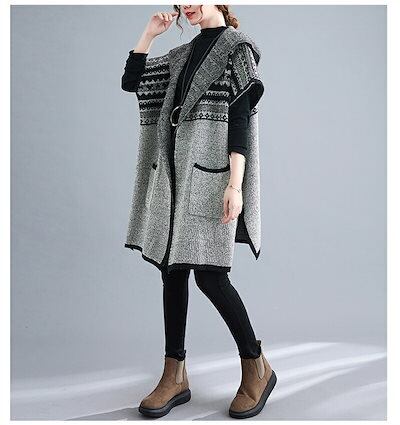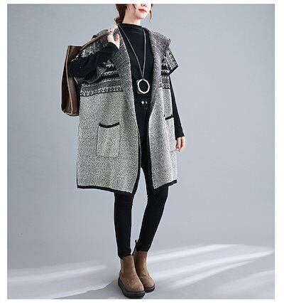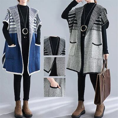 【2点購入25O円OFF】ニット ベスト パーカー レディース 秋 冬 前開き ニットベスト フード付き ドルマン 幾何柄 サイドスリット ポケット ふんわり フレンチスリーブ ジャケット ゆったり