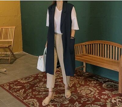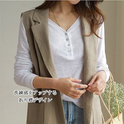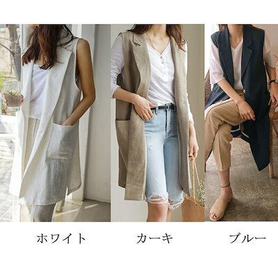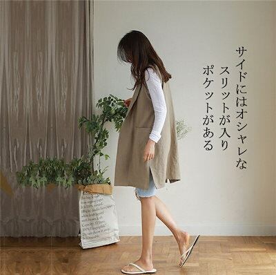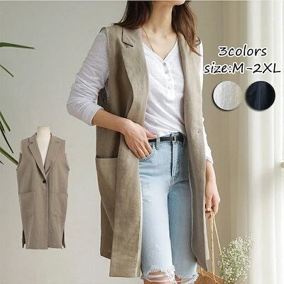 【2点購入25O円OFF】ジレ レディース 春夏 ベスト 前開き ロングジレ ロングベスト リネン 大きいサイズ 麻 綿麻 ポケット折り襟 開襟 ボタン飾り スリット入り ゆったり カーディガン ノ