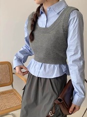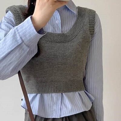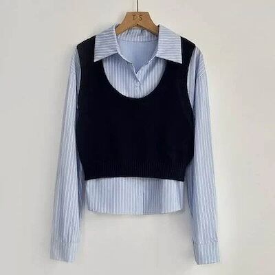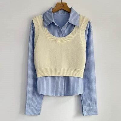 トップス レディース 2点セット 長袖シャツブラウス Uネックニットベスト ボタン 前開き ショー ベスト
