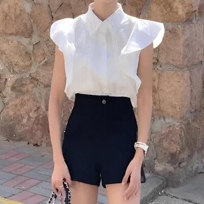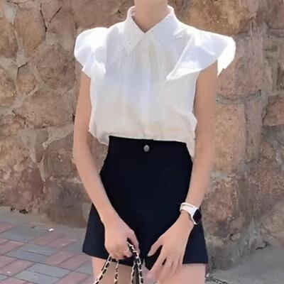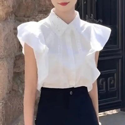 【急速出荷!】フリル袖 カットソー ブラウス レディース シャツ 袖コンシャス フレンチスリーブ クロシェ かぎ編み 襟付き 前ボタン 刺繍 清楚 エレガント ホワイト 白