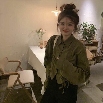 破格値トップス シャツ レディース 長袖 襟付き ボタン ブラウス ショート丈 ミディアム丈 リボン フリル デザイン袖 バルーン袖 ボリューム袖 オールシーズン 春 夏 秋 冬 カーキ 無地 ボタン