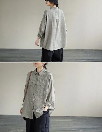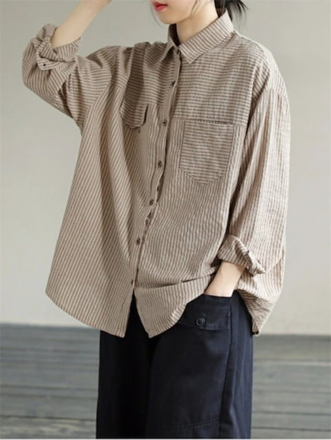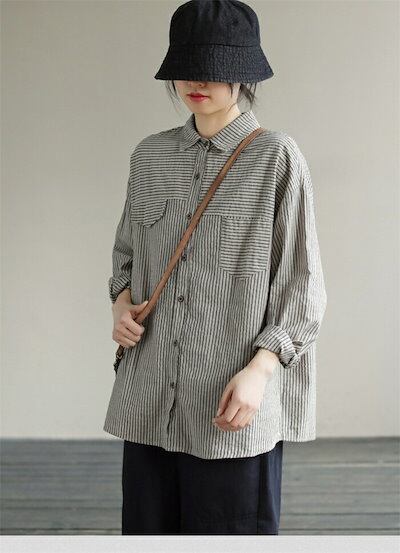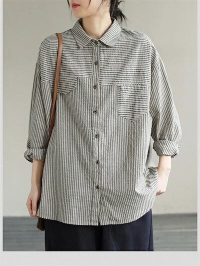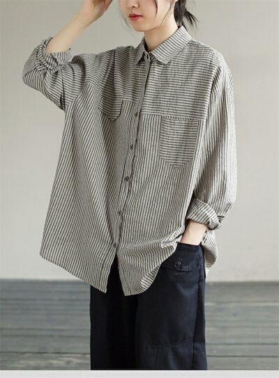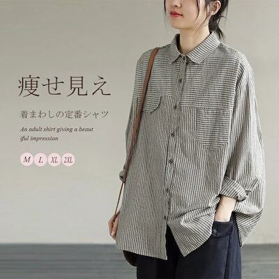 長袖シャツ シャツ トップス レディース シャツブラウス 秋 ブラウス 春 チュニック ストライプ柄 ホワイトシャツ オーバーサイズ 前後差あり ボタン付き 折襟 体型カバー ボーダー柄 長袖 羽織り