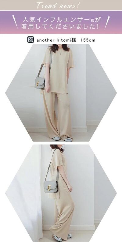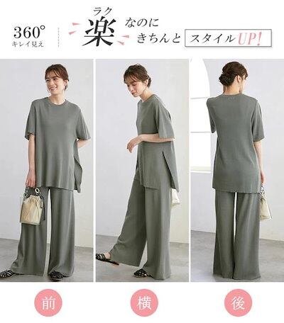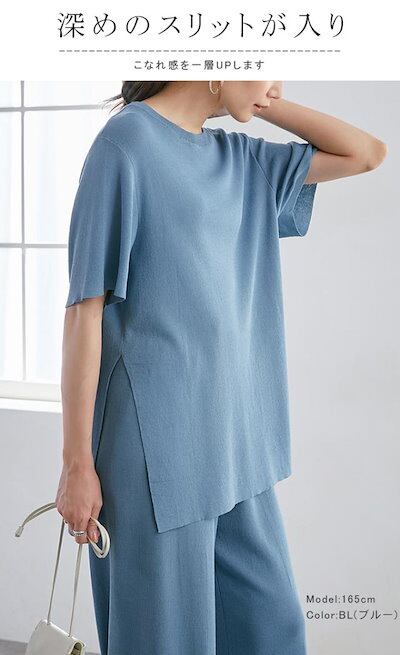 カレイkarei セットアップ レディース 半袖 冷感素材 Tシャツ サマーニット ワイドパンツセット ガウチョパンツ スリット入 01OS7813-1