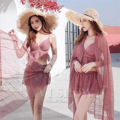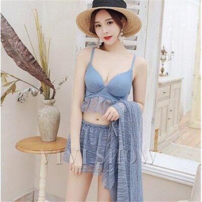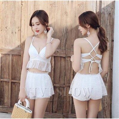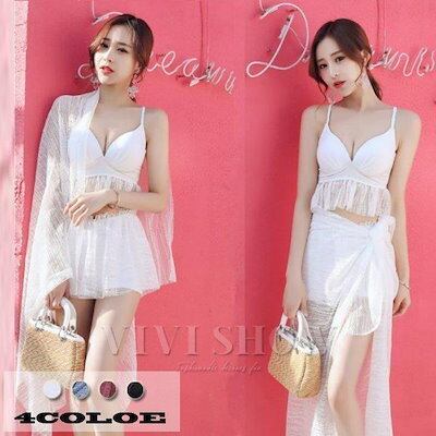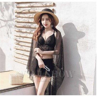 水着レディースオフショルバンドゥビキニ3点セットロングスカート付きレースアップスイムウェア体型カバーストライプ無地柄