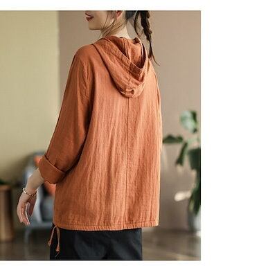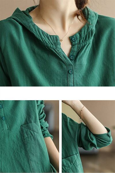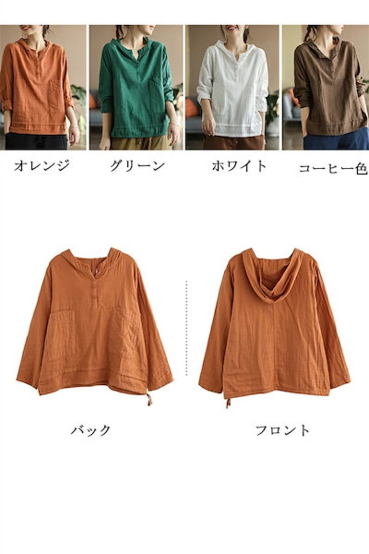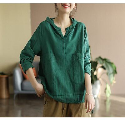 リネン風 シャツ 長袖 パーカー レディース tシャツ 薄手 フード付き カジュアル トップス 春 秋 体型カバー プルオーバー シンプル 白 コーヒー色 オレンジ グリーン 20代 30代 40