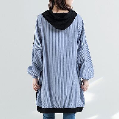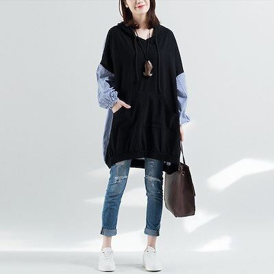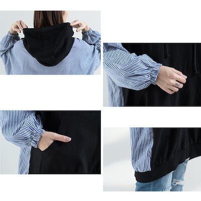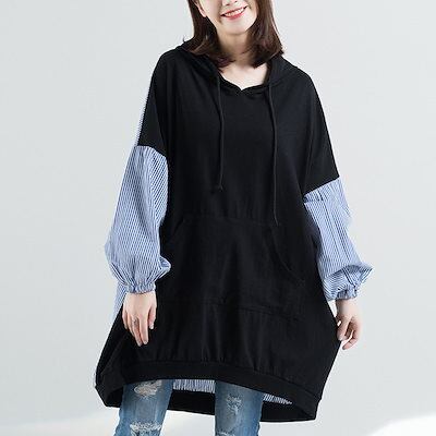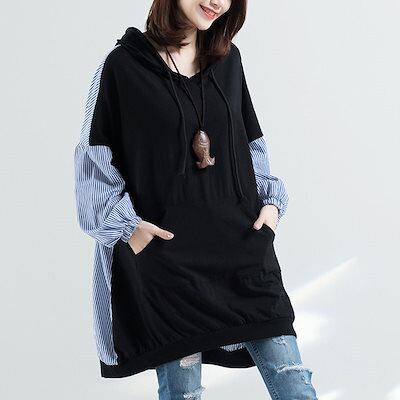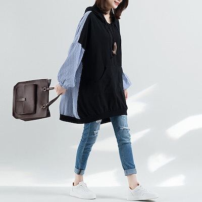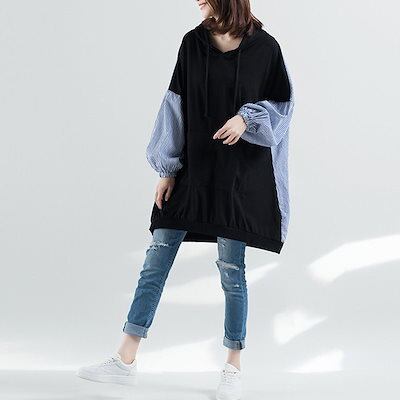 パーカー レディース 薄手 春 秋 フーディー プルオーバー 異素材 トップス 長袖 ロングパーカー ストライプ ドッキング チュニック フード付き ゆったり おしゃれ カジュアル 大きいサイズ 大人