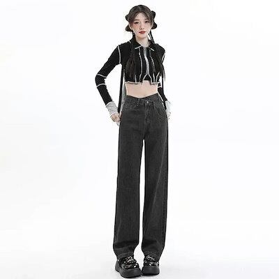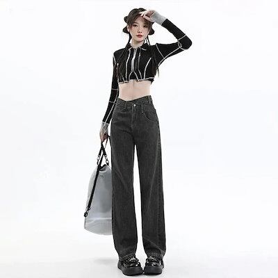 レディースデザイン性重視ストレートのボトムス ベルト付き 冬 ワイドパンツ ロング丈 デニムパンツ 秋 ロングズボン 春 ワイド ジーンズ ジーパン 夏