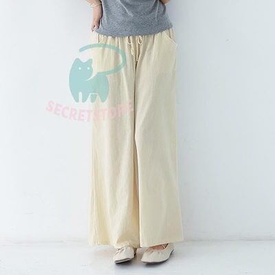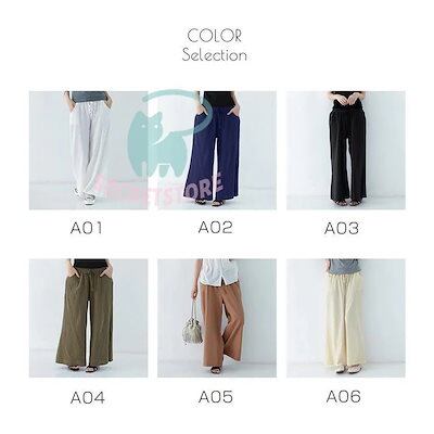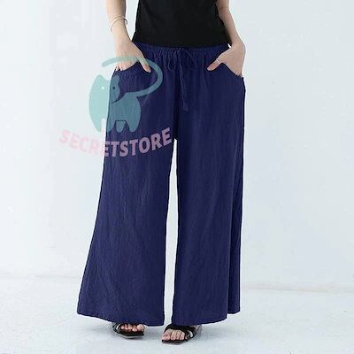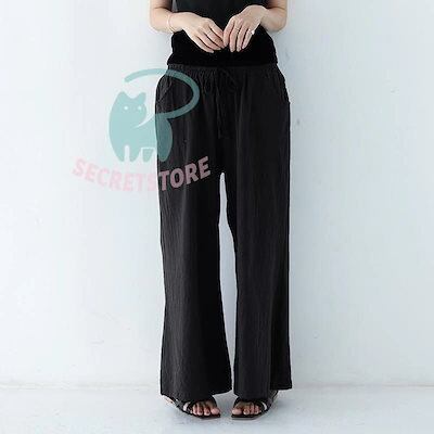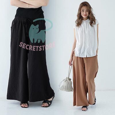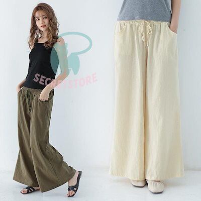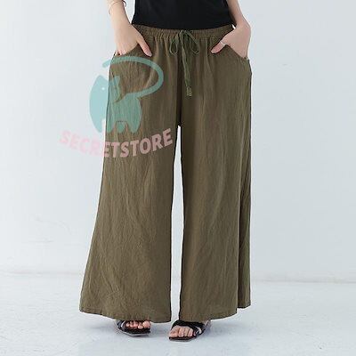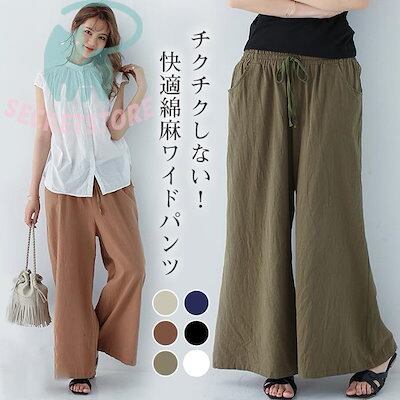 【3日出荷】新品(タイム)ワイドパンツ ガウチョパンツ レディース 綿麻 ボ 麻混 ゆったり 体型カバー ズボン 夏 無地 ウエストゴム ポケット付