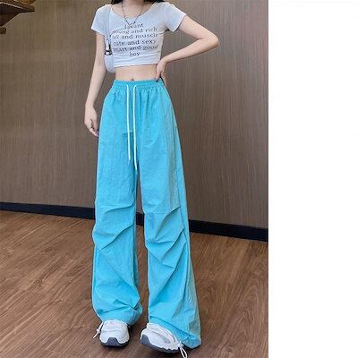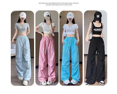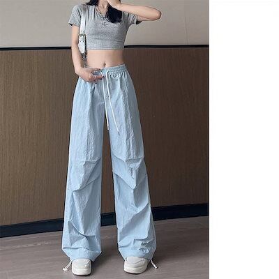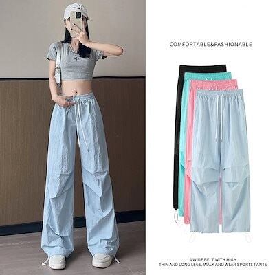 2025春夏カーゴパンツ ロングパンツ ルーズ ワイドパンツ ワイドレッグ ボトム ハイウエスト ポケット付き シンプル カジュアル 韓国ファッション ひんやりボトムス