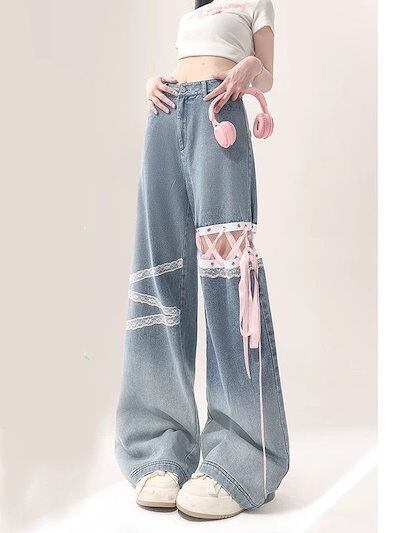 夏の薄手レースカットオフ女グラデーションハイウエストバインドストレートワイドパンツ
