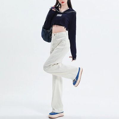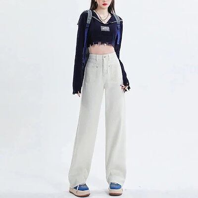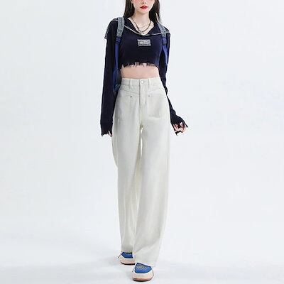 激?れ人気商品 脚長効果!デニムパンツ かっこいい!スラックスパンツ ストレートジーンズジーンズ百掛け 春夏 ハイウエスト ホワイト ゆったり ワイドパンツ