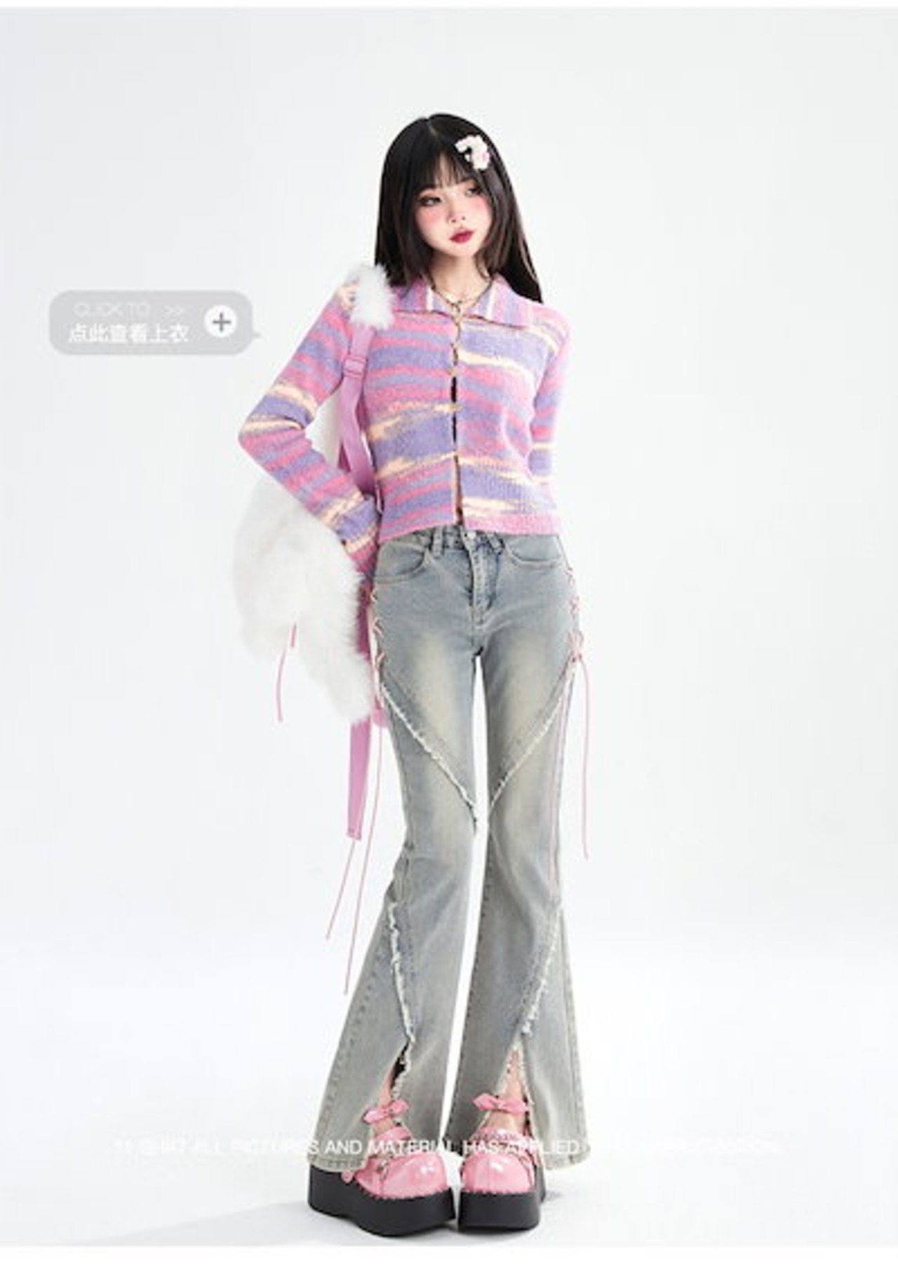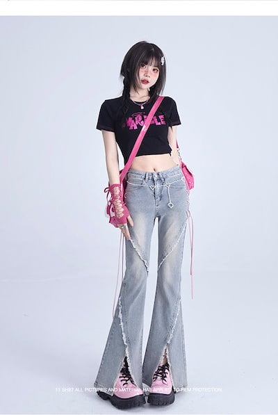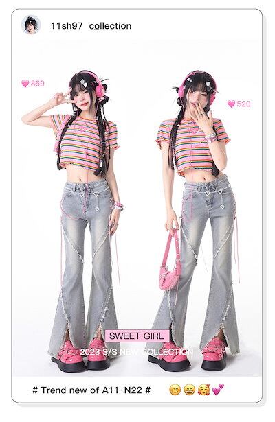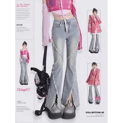 2024夏 韓国 デニムパンツ ボトムス ジーンズ ハイウエスト ファッション系ワイド スタイルサイド紐が付い ゆるダボ ジーンズ シルエット加工 レディース カジュアル メンズライク