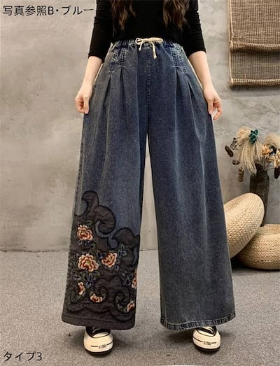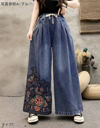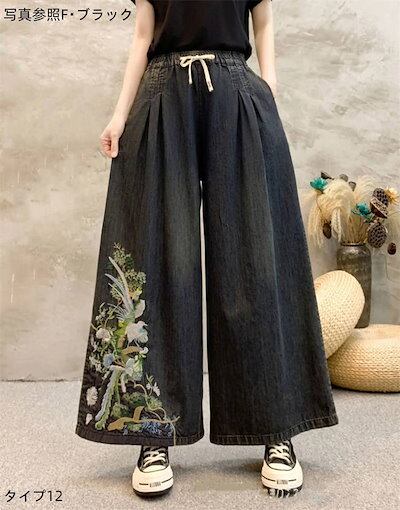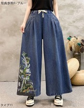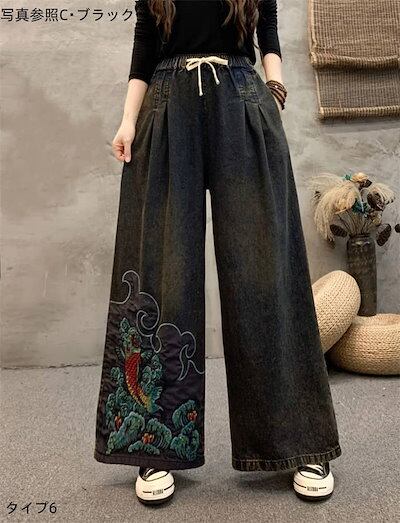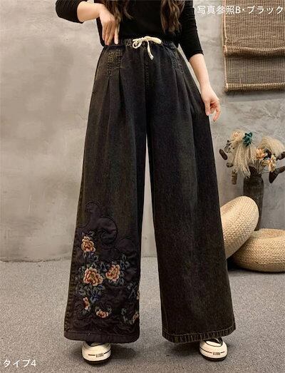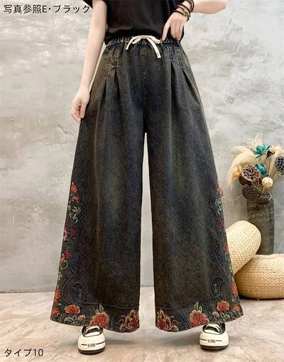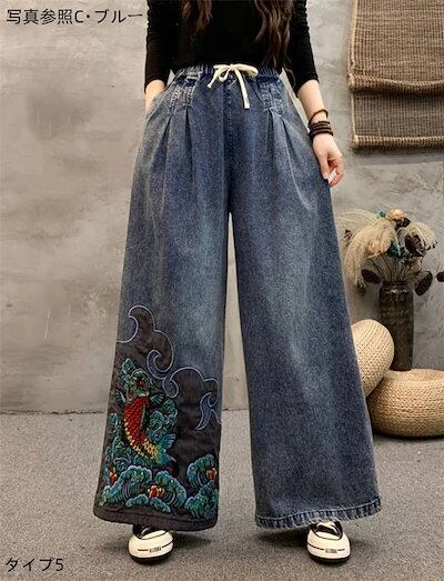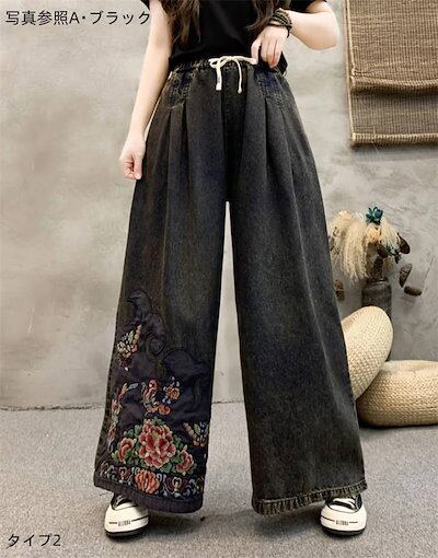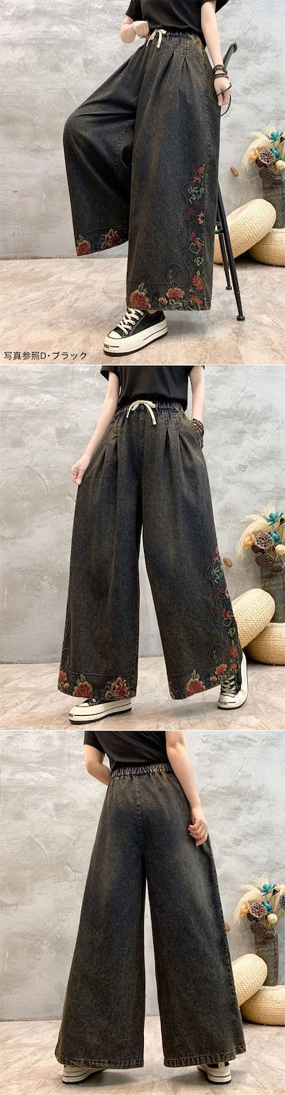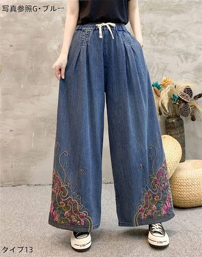 デニム記念セールパンツのレディース 刺繍 ワイドパンツ ロング デニムパンツ 花柄 綿 コットン ロングパンツ ストレートパンツ ワイド ゆったり ウエストゴム 紐 春 秋 ポケット 着痩せ カジュア