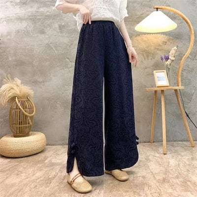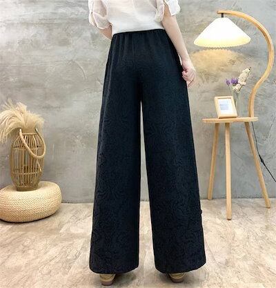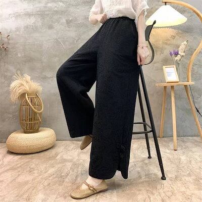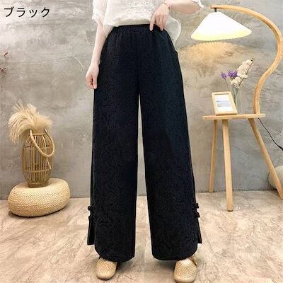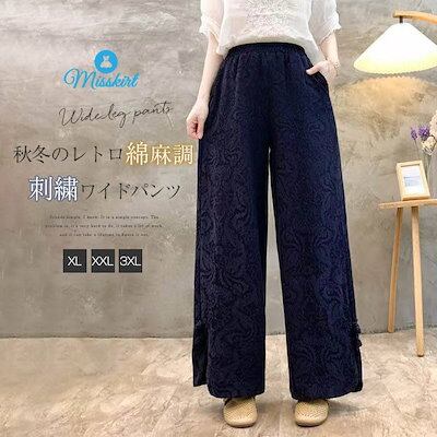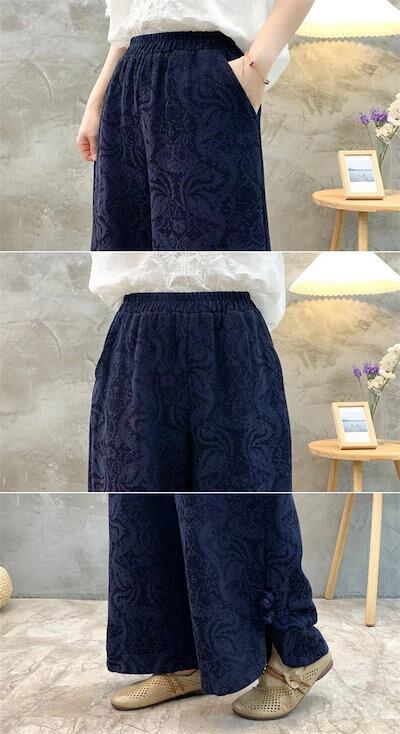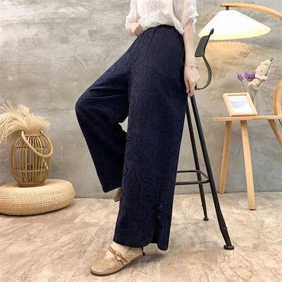 パンツ一歩前へワイドパンツにレディース 新作 ジャカード 無地 厚手 綿 スリット ボトムス ストレートパンツ ロングパンツ ボタン ウエストゴム ワイド ゆったり 秋 冬 レトロ 着回し カジュアル