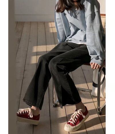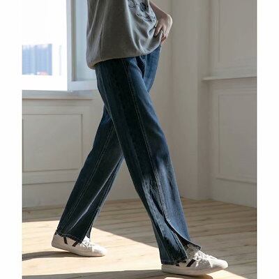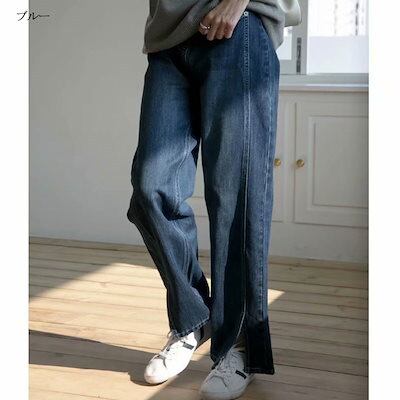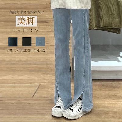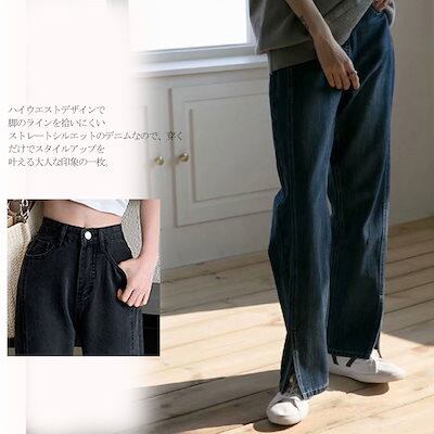 ワイドパンツ時間を創出するレディースでストレートパンツ デニム ガウチョパンツ 春 夏 サイドスリットパンツ ハイウエスト ジーパン ポケット付き ゆったり オフィス ボトムス ワイド 無地 ライトブ