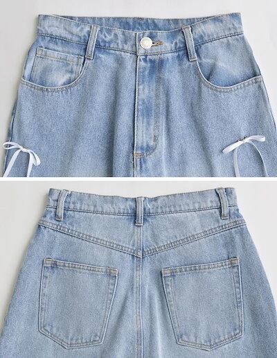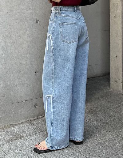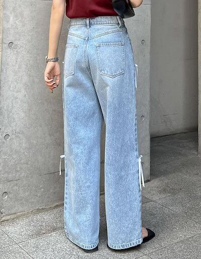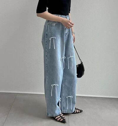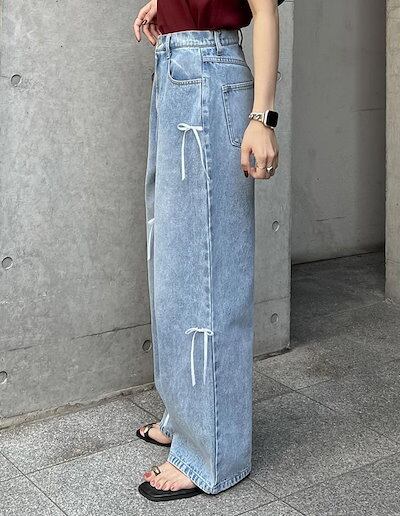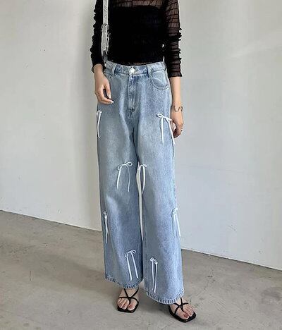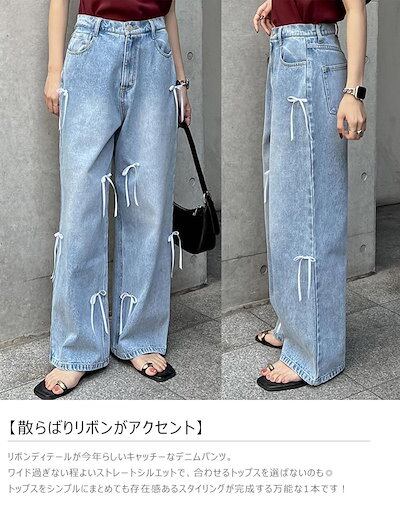 ワイドパンツクオリティデニムのリボン レディース 春 夏 秋 ガウチョパンツ デニムパンツ 体型カバー ハイウェスト ストレートパンツ 大きいサイズ おしゃれ ゆったり カジュアル ナチュラル カジュ