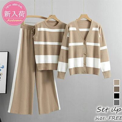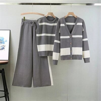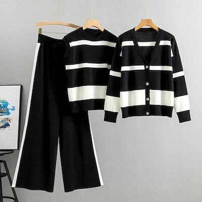 ニットセットアップ レディース 秋冬新作 ニット3点セット 長袖ニットカーディガン ボーダー柄 ベストセーター ワイドパンツニットセットアップ 部屋着 カジュアル ゆったり オシャレ40代50
