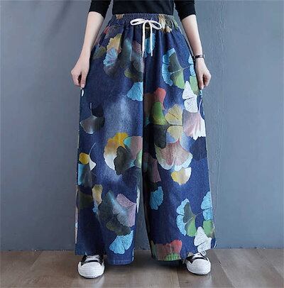 ワイドパンツ デニム ガウチョパンツ レディース ロング パンツ ボトムス 花柄 プリント 銀杏の葉 体型カバー ロングパンツ シンプル 大きいサイズ 春 秋 冬 ハイウエスト 着痩せ 美脚 レトロ