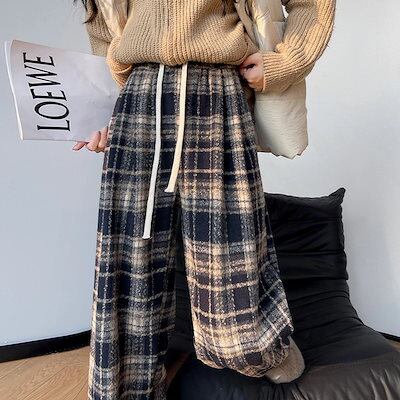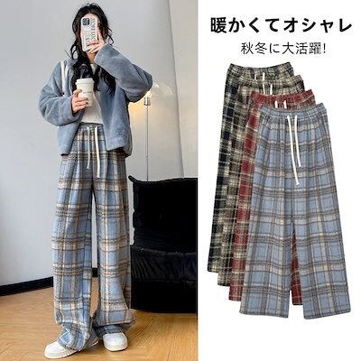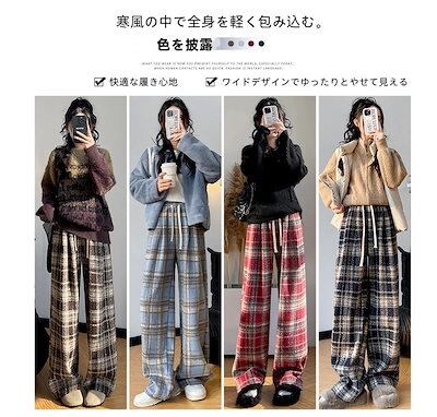 韓国ファッション 秋冬ズボン 裏起毛 ストレートズボン冬 厚手 保温 スラックス ゆったり チェックズボン ズボンレディースワイドパンツ 冬