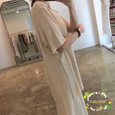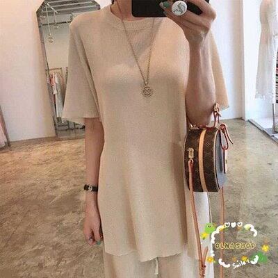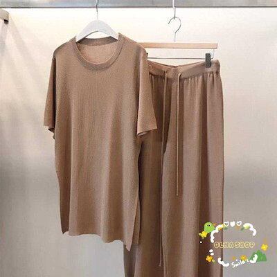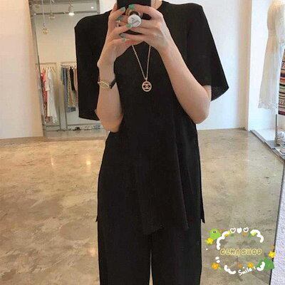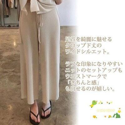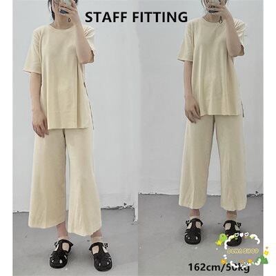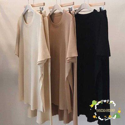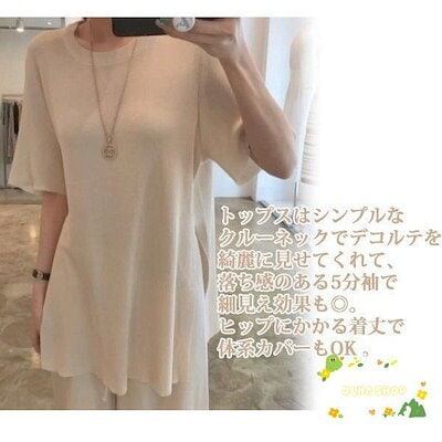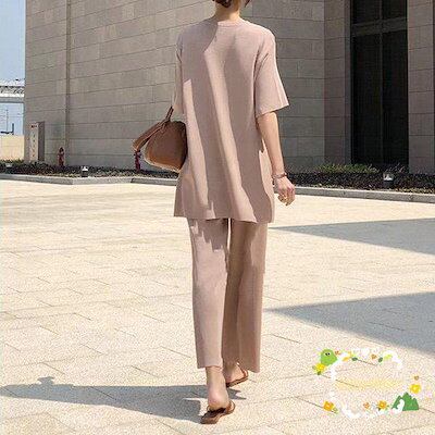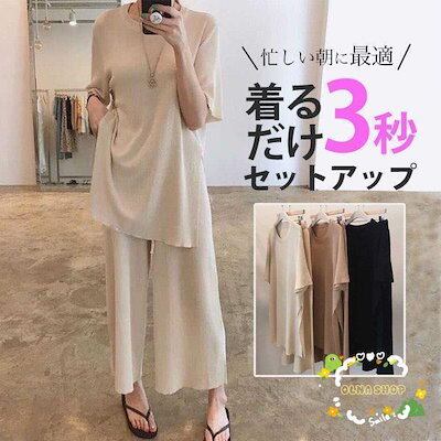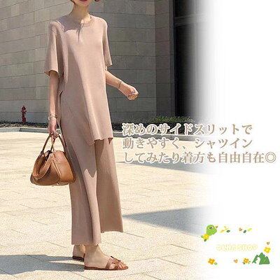 セットアップ レディース サマーニット 上下セット 快適 半袖 ワイドパンツ スリット カジュアル 大人 春 夏 体型カバー おしゃれ 30代 40代
