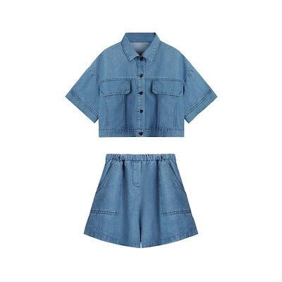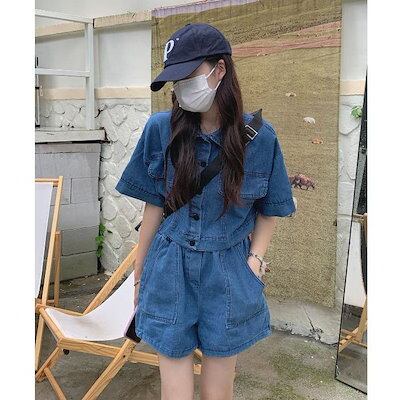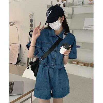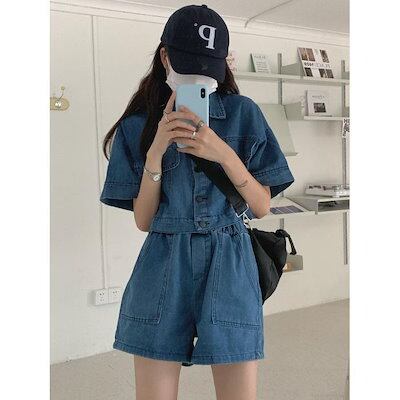 デニム 上下セット レディース ショートパンツ デニムシャツ 半袖 デニムジャケット 2点セット 短パン ゆったり 半袖シャツ セットアップ