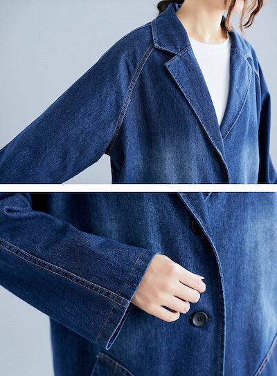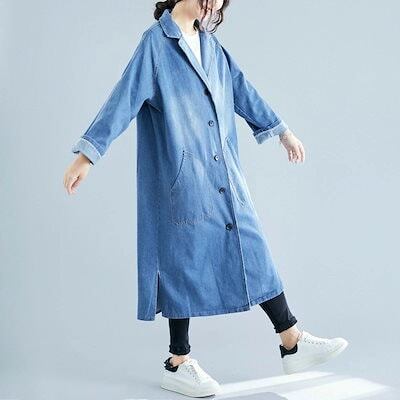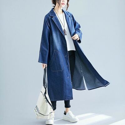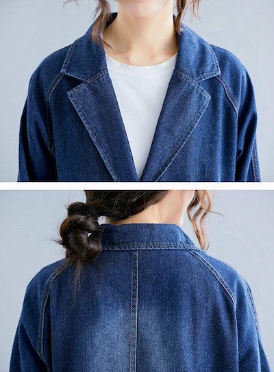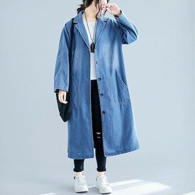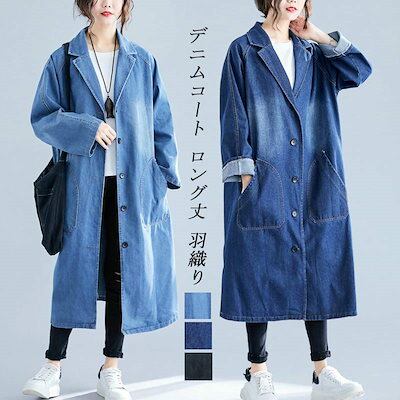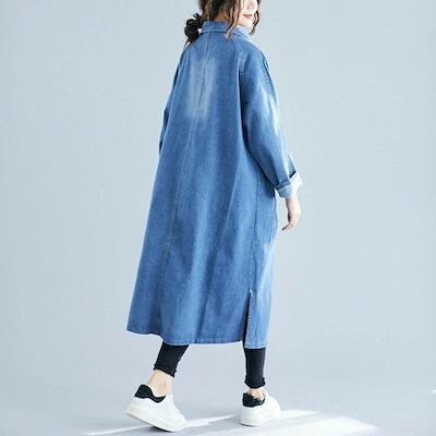 デニムコート レディース 春 秋 デニム トレンチコート 長袖 襟付き ポケット付き ロングコート スリット 無地 前開き 羽織り フレア コート ゆったり 体型カバー デニムジャケット アウター カ