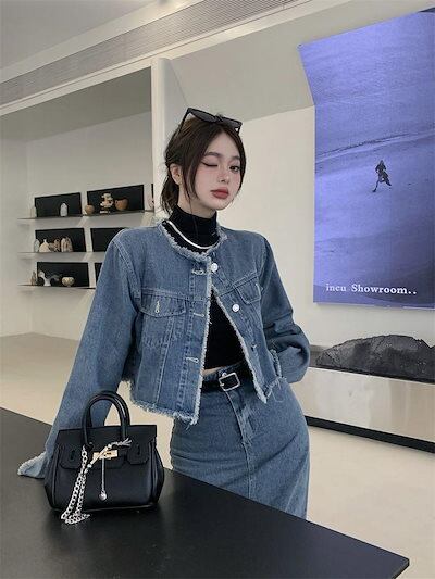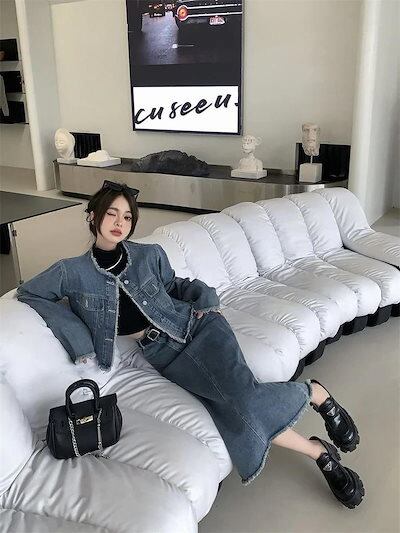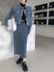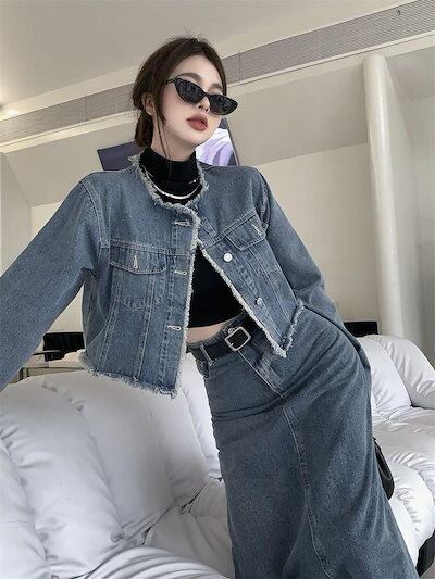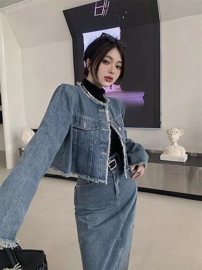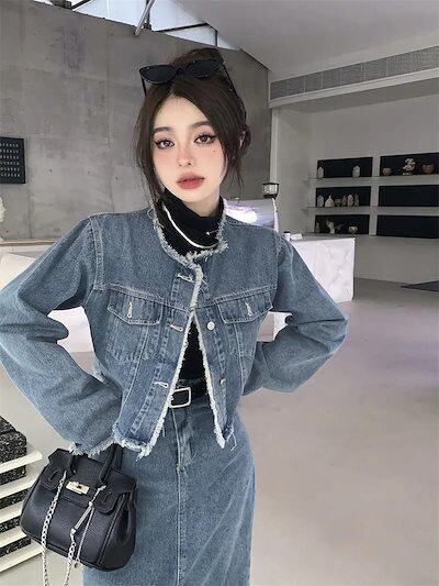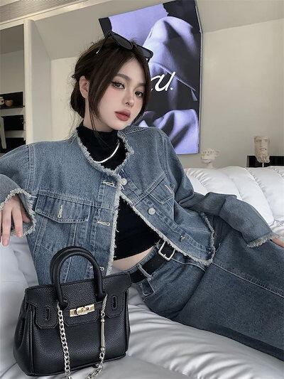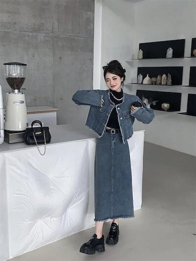 【本日限定】アメリカンレトロ 春秋 デニム ジャケット +セミロング丈 半身スカートセットアップ 2点セット