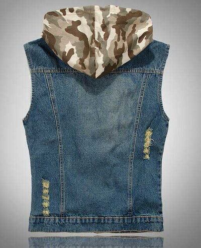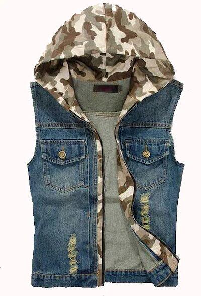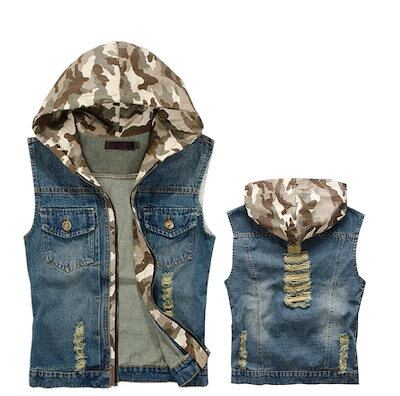 メンズデニムベスト/袖なしデニムブラウス/お兄系デニムジャケット/Gジャン袖無し チョッキ/ライダースデニムアウター/ダメージ加工ノースリーブ/迷彩柄フード付き取り外す可能