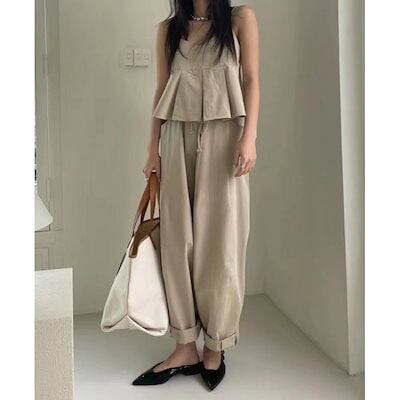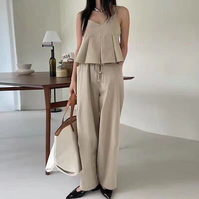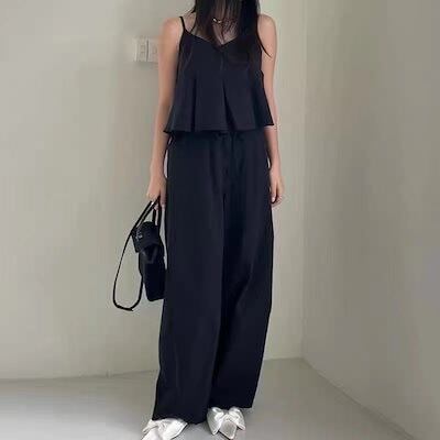 夏の日本と韓国スタイルのプリーツキャミソールカジュアルハイウエストゆったりワイドレッグパンツスーツレディース