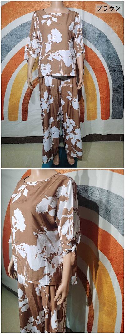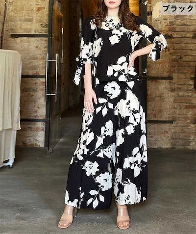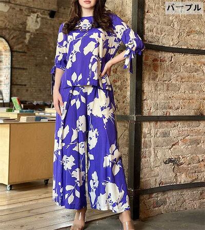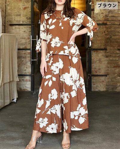 セットアップ ワイドパンツ ブラウス 紐 ロング パンツ レディース 2点セット シャツ 花柄 プリント 五分袖 9分丈 新作 春 秋 パンツセット 大きいサイズ 体型カバー カジュアル 通勤 OL
